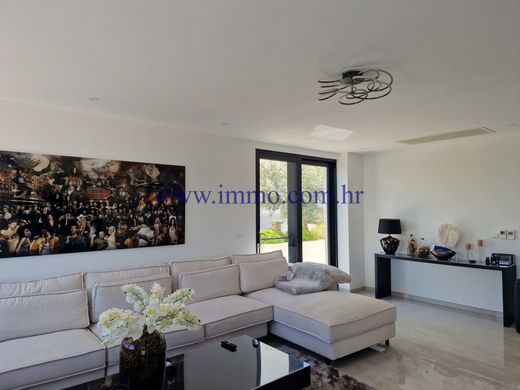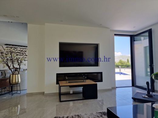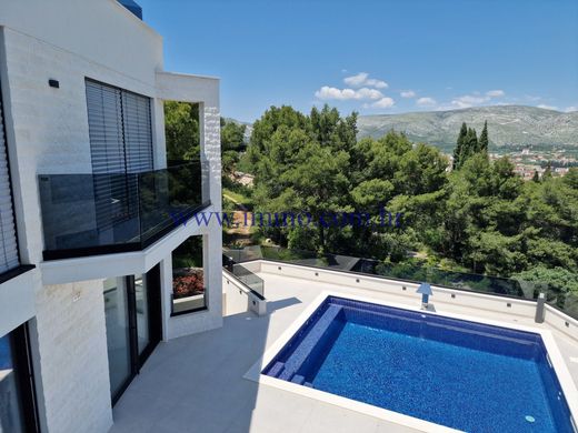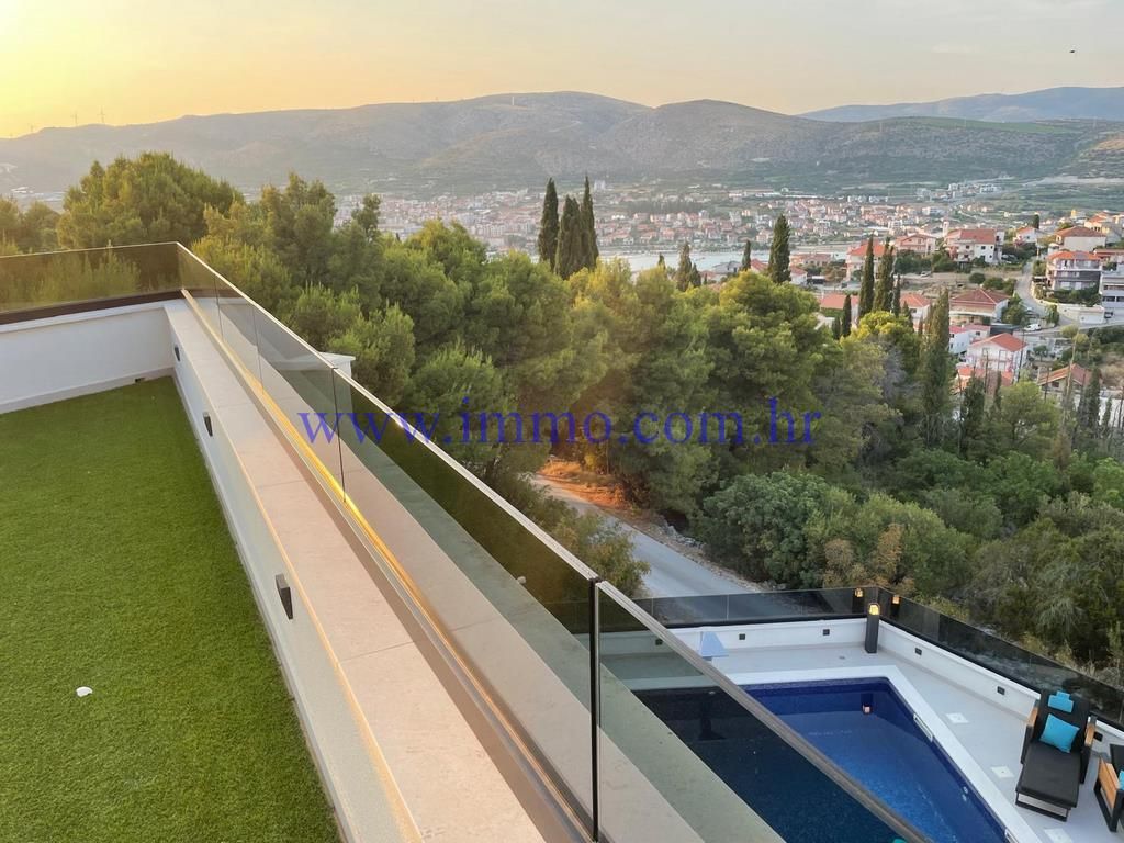 È in vendita una lussuosa villa nuova, situata in una posizione tranquilla sull'isola di Čiovo, a 450 m dal mare. La villa è situata su una collina immersa nel verde naturale e si sviluppa su quattro piani collegati da scale interne, offrendo una bellissima vista panoramica sui dintorni. La villa è stata costruita nel 2022 utilizzando tecnologie moderne e materiali di alta qualità, è dotata di riscaldamento a pavimento, aria condizionata centralizzata, tapparelle elettriche telecomandate, sistema di videosorveglianza e gli interni della villa sono arredati con eleganti mobili di design. Grazie alle ampie finestre a tutta altezza, la villa è inondata di luce naturale e la sua particolare disposizione aggiunge un tocco di lusso.