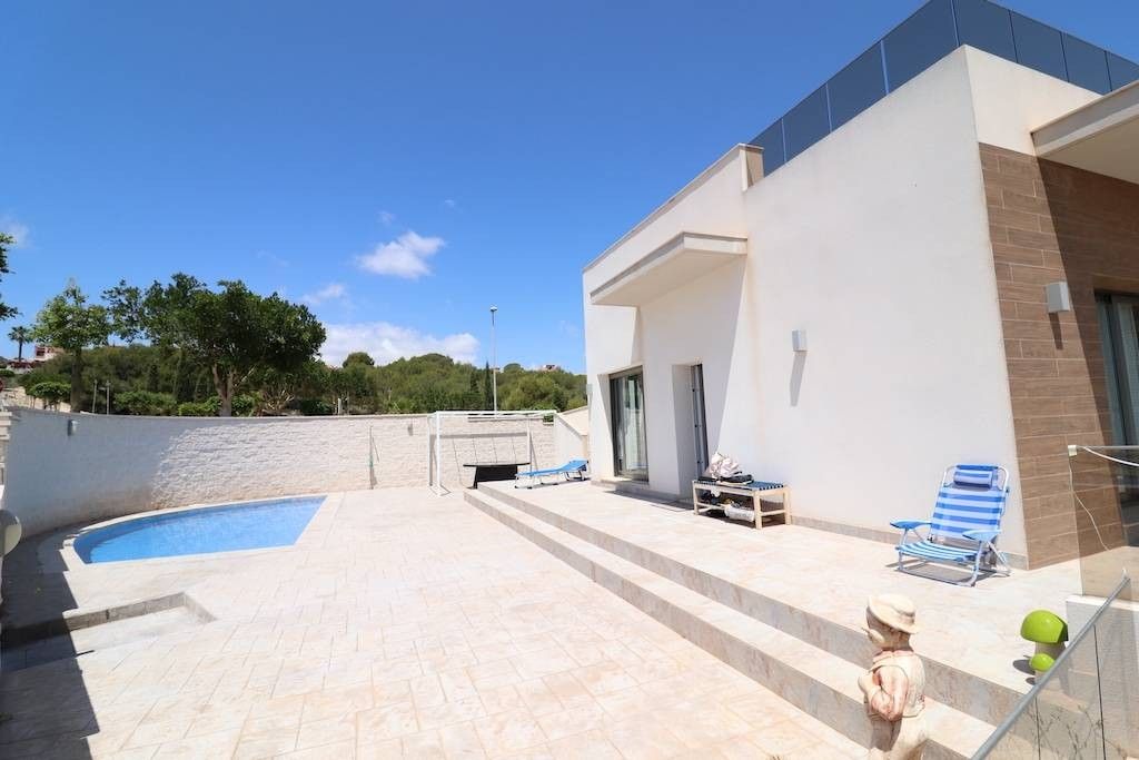 Residencial Vista Bella, San Miguel de Salinas, villa d'angolo con vista sul mare e le saline di fronte al parco e orientamento sud con un terreno di 405 m2 e una casa su un piano di 100 m2 con 3 camere da letto, 2 bagni, cucina con la sua isola aperta sul soggiorno e un garage con accesso diretto alla casa di 153 m2, La casa ha un solarium di 60 m2, piscina privata e viene venduto arredato e climatizzato.