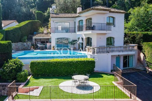 Villa provenzale costruita su 3 livelli con vista panoramica sul mare su tutta la baia di Théoule e Cannes, a pochi passi dalle spiagge sabbiose e dai ristoranti del villaggio di Théoule, a 15 minuti dalla Croisette di Cannes. La villa comprende un doppio soggiorno con camino, una sala da pranzo e la nuova cucina americana, il tutto aperto sulla zona piscina e sulla cucina estiva, sulla lavanderia e sul ripostiglio; Al piano superiore 3 bellissime camere da letto en-suite ciascuna con il proprio bagno, un'ulteriore camera da letto/ufficio, le stanze di questo livello hanno anche accesso alla piscina dal giardino; Al piano terra appartamento con camera e bagno, angolo cottura e ripostiglio. Posti auto privati all'interno della proprietà. Stato dei rischi e dell'inquinamento: raggiunto (nullo)