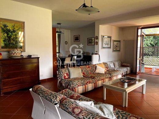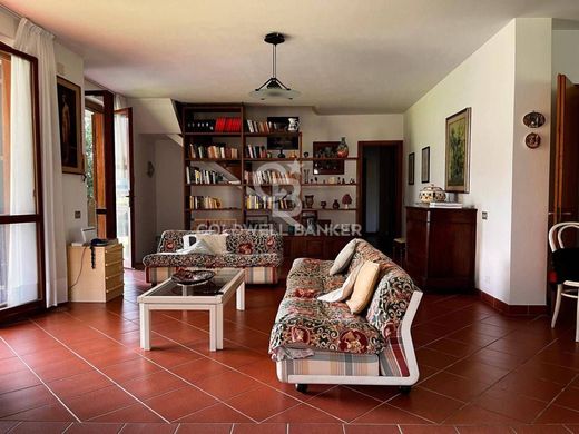 Al piano seminterrato si trovano quattro locali ad uso cantina, due bagni, un ampio deposito per attrezzi da giardino, un garage doppio e un box per moto e biciclette, spazi funzionali che garantiscono comodità e versatilità. Il piano rialzato accoglie gli ospiti con un elegante ingresso che conduce a un soggiorno doppio, perfetto per momenti di relax e convivialità, oltre a una sala da pranzo separata e una cucina spaziosa e ben attrezzata. Un disimpegno dà accesso a un bagno di servizio, mentre la zona notte comprende tre ampie camere matrimoniali, doppi servizi e un comodo ripostiglio. All'esterno, una splendida terrazza su tre lati, allestita per pranzi e cene all'aperto, offre uno spazio privilegiato per godere della tranquillità del giardino.