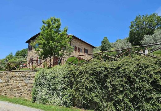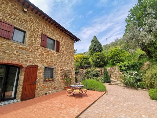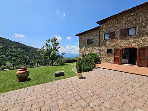 REGGELLO - a brevissima distanza dal paese e dai servizi, in posizione dominante, splendido casolare con esterni a pietra di mq. 366 circa con terreno circostante per complessivi Ha 3,4 comprensivi di parco per mq. 5000 e giardino intorno al fabbricato per mq. 600 e terreno agricolo terrazzato con oliveto, con 1.400 olivi in produzione certificato. Impianto di irrigazione, pannelli solari, tettoia per 2 posti macchina e altri annessi. Ottimo stato di manutenzione. Internamente lo spazio è suddiviso su tre livelli. Ampio ingresso da cui si sviluppa una splendida zona giorno/pranzo con cucina a vista e camino oltre a varie aperture sul giardino, due camere e bagno. Al piano superiore un bellissimo salone con focolare con vedute panoramiche sulla campagna circostante oltre a gradevole loggia coperta per piacevoli pranzi e cene dove godere del panorama; altre due camere matrimoniali con soppalchi, 2 bagni e piano superiore mansardato adibito a confortevole ampio studio/stanza per hobbies, ideale anche come ulteriore camera. Molto ben curato sia all'interno che all'esterno. Cancello automatico. Vicinanza a sentieri e percorsi naturalistici di grande interesse.