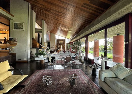 Un viottolo nel prato verde, parzialmente coperto da porticato, porta al portoncino d’ingresso, che si apre sull'ampio e luminoso soggiorno, a doppia altezza e con soffitto in legno, circondato da immense vetrate con vista sul giardino. Il salone ruota intorno ad uno splendido camino in marmo bianco greco con cappa in rame. Un porticato, che circonda le vetrate, separa il salone dal giardino e permette di mangiare all’esterno al coperto. Salendo pochi gradini troviamo la zona pranzo, adiacente alla quale si trova la cucina abitabile con la sua dispensa e ulteriore portico con zona barbecue. Allo stesso livello trovano posto lavanderia, stireria, bagno, sauna e tinello, utilizzabile come area TV o per pranzi e cene importanti.
