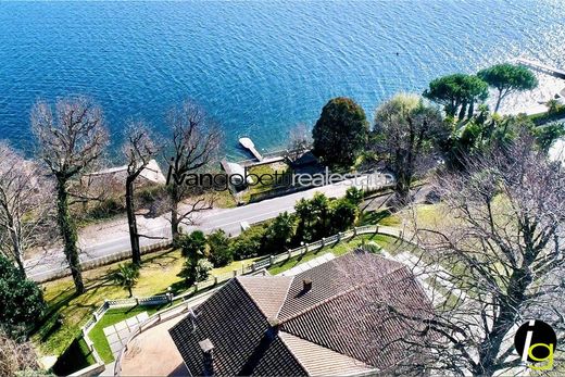 Lago Maggiore Stresa Villa con spettacolare vista lago e spiaggia privata. Situata tra Stresa e Belgirate sul Lago Maggiore, bellissima villa di particolare architettura, con facciate rifinite in pietra locale. La villa è disposta su tre piani ed è cosi composta: al piano terreno ampio ingresso, ampia cucina pranzo comunicante con la taverna, una sala da bagno, un grande salone attualmente destinato a sala biliardo, il tutto si affaccia su di un ampio porticato da cui si gode uno stupendo panorama a 180 gradi sul Lago. Al piano primo, ampio soggiorno con camino, cucina, bagno di cortesia, bagno, due ampie camere da letto. Il soggiorno si affaccia su di un grande terrazzo con eccezionale vista dominante il Lago, il quale nella bella stagione si trasforma in salotto esterno. Al piano secondo alcuni ambienti da destinarsi a guardaroba, ripostiglio o camere ospiti. La villa è in buone condizioni generali ed ha una superficie di circa 500 mq. Il terreno che circonda la villa ha una superficie di circa 3000 mq, ed è ottimamente piantumato. Completa la proprietà un bellissimo giardino a lago, con una serra, un bagno con doccia a servizio della spiaggia privata ed il pontile per l'attracco barche.