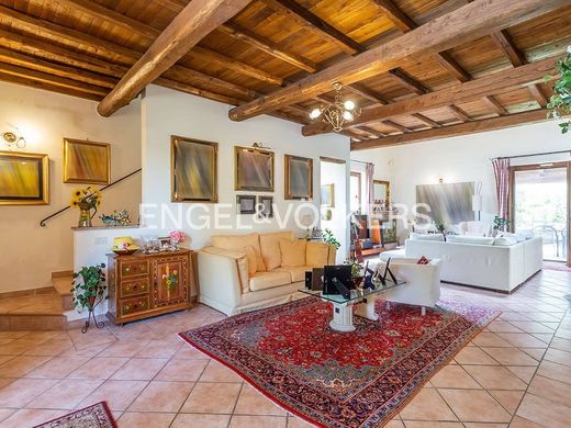 In località Trevignano Romano vicina al caratteristico borgo sul lago di Bracciano, proponiamo in vendita una splendida villa unifamiliare di mq.291 catastali con pratica in essere di eventuale ampliamento per ulteriori ca.mq.100, immersa nel verde, con ampio parco di circa mq.16000 con piante ornamentali ad alto fusto, ulivi e frutteti, con una gradevole terrazza arredata esposta a sud su uno dei due portici per un relax a 360 gradi, ed un ampio parcheggio con tettoia per tre posti auto. Da un piacevole viale d'ingresso alberato, si accede alla proprietà, signorile e riservata, disposta su tre livelli. E' composta, al piano terra, da un meraviglioso salone doppio con camino ed una sala da pranzo, con soffitti alti 6,00 metri con travi a vista e pavimenti in cotto, una gradevole cucina abitabile arredata, una camera da letto/studio ed un bagno per gli ospiti; al primo piano, con pavimenti in parquet e travi a vista, si trovano una suite matrimoniale con bagno en-suite, una seconda camera da letto ed un secondo bagno. Al piano seminterrato è presente un secondo grande salone, altre due camere da letto e due bagni, uno con lavanderia, ed un ripostiglio. La villa, in ottime condizioni, è dotata di riscaldamento autonomo con due caldaie a gas e camino, un impianto di depurazione dell'acqua con dispositivo di filtrazione di ultima generazione Aquamed e impianto di allarme. Completa la proprietà un appartamento al piano terra, in buone condizioni, composto da ingresso, cucina/tinello, saloncino, due camere e due bagni. Ottima soluzione abitativa per chi è amante del lago e della campagna, la villa gode di elevata privacy e riservatezza, comunque vicinissima al centro storico di Trevignano Romano, ai circoli velici ed agli stabilimenti balneari sul lago, a soli 20 km dal mare e 40 km dalla città di Roma.