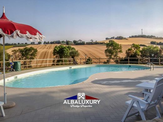 La piscina è stata gode di una posizione strategica che offre una vista panoramica sulle colline coltivate a grano e girasoli, regalando momenti di relax e aria fresca. Questa straordinaria proprietà è un rifugio di serenità che offre il meglio delle colline marchigiane e la comodità della vicinanza al mare.