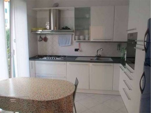 A pochi passi dal mare e dal centro, si propone bellissima villetta a schiera cosi' composta: al piano seminterrato, posto auto privato coperto, ampio box auto, bagno e stanza attualmente adibita a cabina armadi/lavanderia; al piano terreno, salone, cucina abitabile, bagno, porticato e giardino su due lati con ingresso indipendente; al piano primo, camera matrimoniale, bagno, terrazzo vista mare e monti con esposizione sud-ovest. Sottotetto di proprieta'. Rifiniture di pregio. Ottima opportunita'. Da vedere!