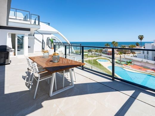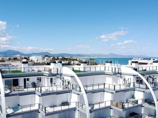 Fantastic luxury penthouse with panoramic sea views, right on the sandy beach of Playa de la Almadraba, located in the modern Taylor Wimpey complex Bella Beach. This exclusive penthouse has stunning sea views from all rooms and also has a roof terrace of no less than 94.85 m2 where you can enjoy spectacular 360° views. To the east, the coastline stretches past Gandia, to the west the Montgo mountain stands out, to the north you look directly out to the sea and to the south you have views of the impressive Sierra de Segaria mountain range.