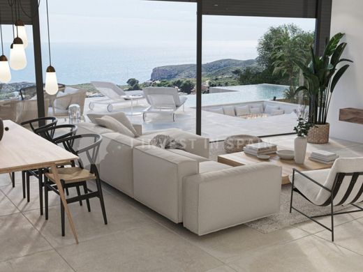 This luxurious villa is located in the prestigious Cumbre del Sol urbanization, one of the most exclusive locations on the Costa Blanca. The plot covers 775 m² and offers beautiful views over the Mediterranean Sea, perfect for those looking for tranquility and a luxurious lifestyle. The villa has a modern and elegant architecture and is spread over two floors, with a total living area of 189 m² and a generous terrace of 112 m². The property features a spacious living and dining room with plenty of natural light, a fully equipped kitchen with high-quality appliances, and a practical laundry room. There are four comfortable double bedrooms, three stylish bathrooms and an additional guest toilet. The layout is designed with comfort and privacy in mind, ideal for both permanent living and vacation accommodation. Outside you will enjoy a beautiful infinity pool surrounded by a large sun terrace where you can relax and enjoy the sea view. In addition, the villa offers a covered carport with space for two cars. Cumbre del Sol is a sought-after residential development in Benitachell municipality, located between the popular beach resorts of Moraira and Javea. This urbanization is known for its impressive views, high-quality infrastructure and excellent amenities. Residents have access to exclusive facilities such as the renowned Lady Elizabeth International School, various sports facilities, supermarkets, restaurants and beautiful natural areas. The area is also a paradise for nature lovers and water sports enthusiasts, with numerous hiking trails and access to idyllic coves such as Cala del Moraig. Cumbre del Sol offers a perfect balance between tranquility and easy access to lively coastal towns.
