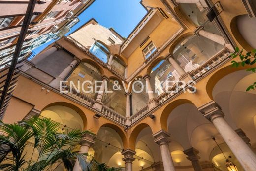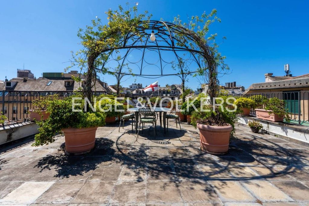 Il palazzo, costruito tra il 1569 e il 1572 per Ambrogio Di Negro, banchiere al servizio della Corona spagnola e doge della Repubblica di Genova, è oggi incluso tra i Palazzi dei Rolli, riconosciuti nel 2006 Patrimonio dell'Umanità dall’UNESCO. Le facciate esterne mostrano una quadratura affrescata e un basamento bugnato, secondo lo stile bramantesco che caratterizza molti palazzi nobiliari genovesi. L’ingresso all’immobile avviene attraverso un portale signorile, illuminato da eleganti lanterne in ferro battuto, che conduce a un loggiato preludio del vano scala. Da qui si innalza una scalinata monumentale in marmo; al piano, completamente privo di barriere architettoniche, si trova un moderno ascensore. Tutta questa eleganza prepara all’emozione del quinto piano, dove un appartamento di circa 400 metri quadrati unisce armoniosamente modernità e storia. La proprietà, ristrutturata con cura vent’anni fa, si presenta oggi in condizioni impeccabili, pronta ad accogliere chi vi entra con la sensazione di un luogo rigenerato e vissuto con amore. I pavimenti in marmo delle sale principali riflettono la luce naturale, creando un’atmosfera luminosa e ariosa. La zona giorno comprende un ampio salone con tripla esposizione, ideale per momenti di convivialità, mentre cucina e sala da pranzo, pur vicine, conservano una propria autonomia. Lo studio, impreziosito da boiserie in legno massello e librerie incassate lungo le pareti longitudinali, rappresenta un vero gioiello: perfetto sia per il lavoro sia per la lettura in assoluto relax. Le tre camere da letto principali sono valorizzate da un caldo parquet in rovere a spina di pesce, due delle quali con bagno en suite. La quarta camera, originariamente destinata al personale di servizio, dispone anch’essa di bagno privato e cabina armadio. Ogni ambiente gode di un affaccio unico: le 18 logge offrono viste su Piazza Banchi e sulle strade circostanti, regalando prospettive differenti del centro storico. Al piano superiore, una terrazza che ricorda un giardino pensile sorprende con la sua dimensione intima: un rooftop avvolto dal verde delle piante, da cui ammirare i tetti della Superba da un’angolazione rara e suggestiva. Non un semplice spazio esterno, ma un luogo di contemplazione e tranquillità in città. Questo appartamento custodisce con naturalezza la propria imponenza, ideale per quelle personalità che vogliono coniugare prestigio e comfort senza rinunciare alla bellezza della storicità.
