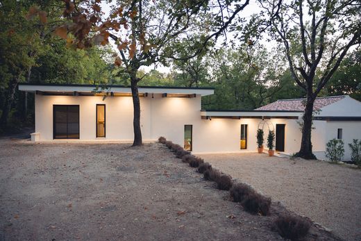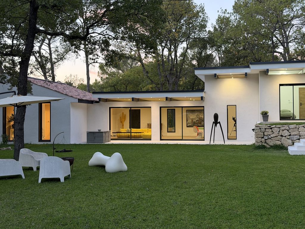 Immersa nel cuore di un bosco di querce, questa proprietà vi lascerà senza parole. Appassionato di architettura e design, il proprietario ha trasformato un piccolo cottage in una casa incredibile dalle linee pulite e decisamente contemporanee. La superficie abitabile è triplicata, raggiungendo i 250 metri quadrati con proporzioni generose, come il soggiorno di 60 metri quadrati e la suite padronale di 40 metri quadrati con bagno e cabina armadio. Tre camere da letto aggiuntive e uno studio indipendente completano questa proprietà, ideale sia come residenza permanente che come seconda casa. I tratti distintivi dell'architettura moderna sono onnipresenti. Pensiline in cemento proteggono le facciate immacolate e le aperture continue a nastro sotto il tetto ricordano quelle che si trovano nelle case di Jean Prouvé o Le Corbusier. Il tetto piano è stato creato come estensione dell'originale tetto a due falde rivestito di tegole provenzali, un perfetto connubio tra modernità e architettura vernacolare locale. L'architetto ha sapientemente preservato i contorni naturali del terreno creando giardini terrazzati che possono essere trasformati in numerose aree relax. Dal soggiorno, lo sguardo è catturato dall'esterno attraverso ampie vetrate che si aprono su un prato verdeggiante, punteggiato di opere d'arte, che si estende fino al limitare del bosco, creando un'atmosfera modernista che invita alla contemplazione. La camera da letto principale gode dello stesso legame con la natura grazie alle finestre a tutta altezza. Se lo si desidera, è possibile realizzare una piscina sotto la proprietà, per mantenere l'armonia di questo ambiente unico. Situata nel comune di Puy Sainte Reparade, a 10 minuti da Puyricard e nelle immediate vicinanze di Château Lacoste, l'aeroporto di Marsiglia Provenza è a 45 minuti di distanza e Aix-en-Provence e la sua stazione TGV a 30 minuti. Ci piacciono: l'ambiente tranquillo e incontaminato immerso nella natura, la posizione, il design architettonico e la qualità della costruzione. Rif: NC021025 Prezzo: € 1.450.000 spese incluse.