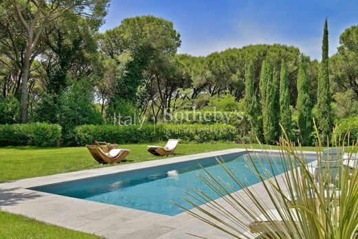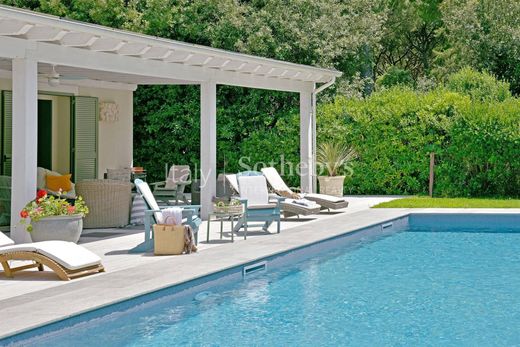 Villa La Loggia si trova all'interno di una meravigliosa tenuta ed è caratterizzata da una spettacolare veranda che offre un ampio spazio esterno. Il pavimento, realizzato con piastrelle di marmo nero intarsiato disposte in motivi geometrici e incastonate in doghe di legno sbiancato, insieme alle travi bianche del soffitto, conferisce all’ambiente un raffinato fascino coloniale. Arredi in midollino e ampie poltrone completano l’atmosfera rilassata e sofisticata.
