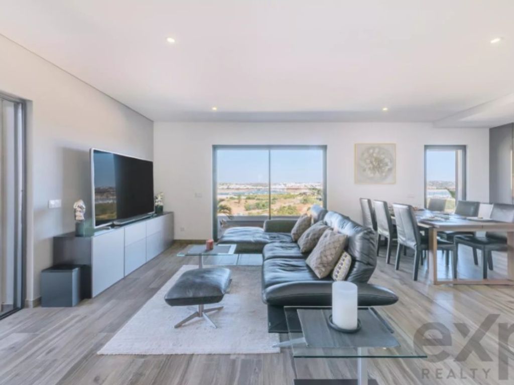 Appartamento progettato dall'architetto all'ultimo piano di Encosta da Marina, con vista libera sul fiume e sul porto turistico di Portimao, una piscina sul tetto e un'enorme terrazza soleggiata ideale per vivere all'aperto e intrattenersi.