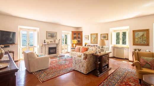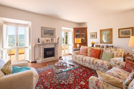 Da una raffinata scala si raggiunge il primo piano, dove ci accoglie un secondo salone con camino e ampie porte-finestre che conducono a un loggiato con vista panoramica. La zona notte è composta da una camera padronale con bagno privato e guardaroba, oltre a quattro ulteriori camere da letto e due bagni.