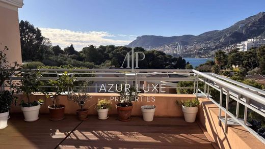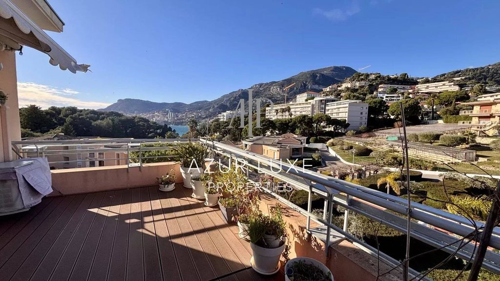 L’appartamento è composto da un bel soggiorno con cucina a vista completamente attrezzata, dotata di arredi su misura di alta qualità. La zona giorno si apre su due terrazze, con una vista eccezionale sul mare e sul Principato di Monaco.
