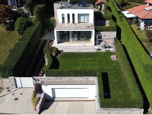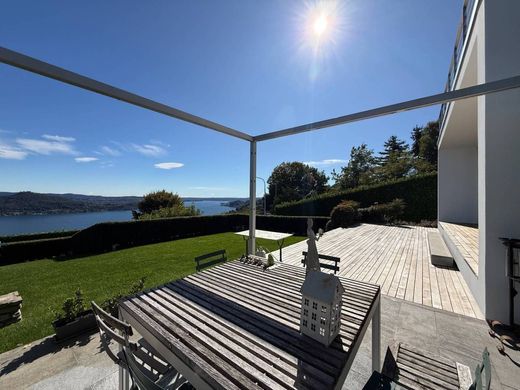 Sulla collina piemontese del Lago Maggiore, tra Stresa e Arona, proponiamo la vendita di una moderna villa con soleggiato giardino e panoramicissima vista del lago.
