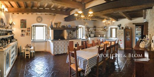 Tenuta di campagna storica con piscina panoramica, parco e terreni in vendita a Umbertide, a est di Perugia. Situata in posizione collinare dominante, nel cuore verde dell’Umbria, questa tenuta d’epoca è immersa in circa 18 ettari di boschi e pascoli, da cui si aprono scorci spettacolari sulla campagna circostante, in un’atmosfera di quiete assoluta e fascino senza tempo, pur restando comodamente collegata ai principali servizi. L’accesso avviene tramite una strada bianca ben tenuta che si snoda dolcemente tra gli alberi, accentuando la sensazione di riservatezza e di arrivo in un luogo speciale. Al centro della proprietà sorge un elegante casale in pietra di 637 metri quadri su tre livelli, restaurato con grande cura nel rispetto della tradizione architettonica umbra. I materiali originali, come i muri in pietra a vista, le travi in legno e i pavimenti in cotto fatto a mano, dialogano armoniosamente con interventi che ne esaltano il comfort e la raffinatezza, in ambienti dal gusto autentico e sobrio. Al piano terra si trovano spazi living che si susseguono con naturalezza: salotto con camino, seconda zona giorno, due camere da letto, bagno e una cantina. Un’ala del casale, con ingresso indipendente dal giardino, è attualmente utilizzata come cantina e deposito. Sempre al piano terra, è presente anche un appartamento indipendente disposto su due livelli, ideale per ospiti o personale, composto da soggiorno con angolo cottura, bagno e zona notte soppalcata. Al primo piano, un luminoso salone con camino in pietra conduce alla cucina in stile rustico e a un ulteriore soggiorno, affiancati da due camere e un bagno. L’accesso, sia interno che esterno, garantisce versatilità e privacy. Il secondo piano ospita un accogliente salotto con camino, due camere da letto, entrambe con doppi affacci sulla vallata, e un bagno, configurando uno spazio intimo perfetto per i proprietari o per ospiti. Completano la proprietà due annessi: una dependance su due livelli con una camera, dal carattere rustico e accogliente, e una struttura di più recente costruzione destinata ai servizi, con cucina, locali tecnici e un portico con archi, ideale per sviluppi futuri nell’ambito dell’ospitalità. La piscina, panoramica e riservata, è incastonata in una posizione tranquilla e dominante all’interno del parco, regalando momenti di relax assoluto con vista aperta sulla campagna umbra. Una residenza di charme che coniuga storia, eleganza e potenzialità ricettiva in uno dei contesti più autentici e suggestivi del Centro Italia.