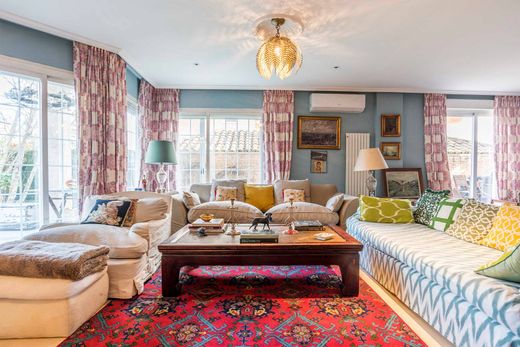 L'abitazione dispone di sette camere da letto e sette bagni —cinque completi e due di cortesia—, offrendo spazi indipendenti e confortevoli per tutta la famiglia. All'interno, l'abbondante luce naturale e i pavimenti in legno conferiscono una sensazione calda e accogliente, rinforzata dalla presenza di un camino che aggiunge carattere al soggiorno principale. La cucina, attrezzata con elettrodomestici di alta gamma, è uno dei nuclei principali della casa, accompagnata da una pratica zona di servizio, lavanderia e aree polivalenti nel seminterrato e nella mansarda che consentono molteplici usi a seconda delle esigenze.