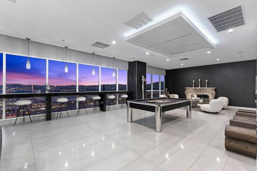 究極のラスベガス・ペントハウス—家具完備、すぐに入居可能。アレジアント・スタジアムを見下ろす、警備付きパノラマタワーの最高の角地に位置します。4つのプライベートバルコニーからは、ラスベガス・ストリップ、山々、そして夕日など、息を呑むような270度の眺望をお楽しみいただけます。この洗練された邸宅は、約4,800平方フィートの壮大な高層住宅で、広々とした間取りと「Design by Sasha」によるシックな仕上げが特徴です。広々としたリビングスペースには、ラスベガスのスカイラインを一望できる壁一面の窓、ドラマチックな高さ20フィートのフローティングバー、暖炉、特注照明、電動シェードが備わっています。3つの豪華なプライマリースイートには、それぞれスパ風のバスルームが備わっています。素晴らしいキッチンには、特大のアイランドキッチン、新しいDacor製家電、6口ガスレンジ、そして300本収納可能なワインセラーが備わっています。エントランスの真向かいに2台の駐車スペースがあります。パノラマ タワーズのアメニティには、ドライバー サービス、屋内スパ、フィットネス センターなどがあります。