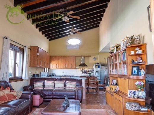Men betreedt de woning via een kleine inkomhal met links daarvan een afzonderlijke badkamer. Rechts is de grote, volledig geinstalleerde open keuken met veel werkruimte. Aansluitend, de zithoek met typisch Spaanse afwerking van de schuine balken in de zoldering. De zithoek geeft direct toegang tot het overdekt buitenterras van waaruit men prachtige ononderbroken zichten heeft op de olijfgaarden.