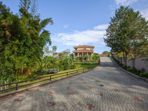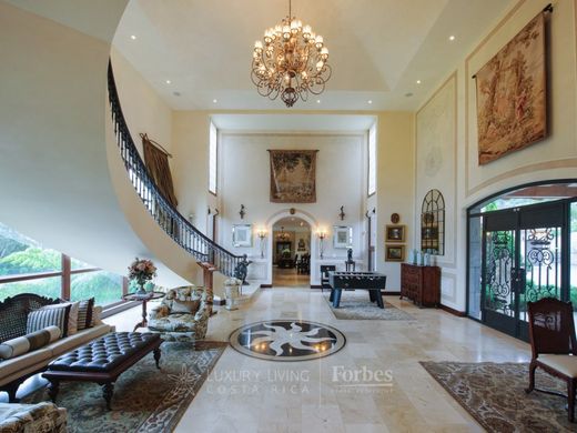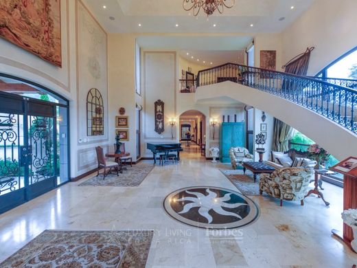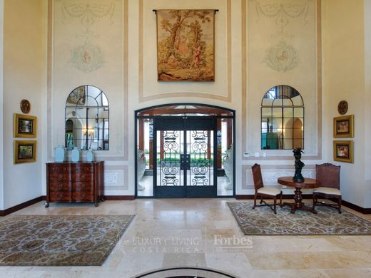 Villa Susan Welkom bij Villa Susan, een prachtig privélandgoed gelegen op een uitgestrekt terrein van meer dan 11.500 vierkante meter, majestueus gelegen te midden van de pittoreske heuvels van San Antonio De Escazu. Aanschouw de adembenemende panoramische vergezichten die zich uitstrekken tot de skyline van de hoofdstad San Jose, de serene centrale vallei en de groene smaragdgroene bergen, die een idyllische omgeving creëren met een altijd heerlijk klimaat, niet te warm en niet te koud. Elk aspect van dit magnifieke landhuis is zorgvuldig en met veel aandacht ontworpen, zowel binnen als buiten, wat resulteert in een ongeëvenaarde mix van elegantie en functionaliteit. Stap binnen in het hoofdgebouw, een meesterwerk van 1.450 vierkante meter (15.911 vierkante voet), waar het ontwerp moeiteloos harmonieert met de weelderige landschapsarchitectuur en het betoverende uitzicht, en luxueuze interieurs naadloos verweeft met de betoverende tropische tuinen en kronkelende paden van het droomland van deze entertainer. U wordt begroet door een elegante vestibule die leidt naar de woonkamer en eetkamer, die sierlijk overgaan in de familiekamer en keuken, die allemaal gracieus overlopen in een van de uitnodigende terrassen met uitzicht op de zorgvuldig onderhouden tuinen en adembenemende vergezichten. Met in totaal elf kamers is er volop ruimte om te genieten. De master suite, gelegen op de tweede verdieping, is een weelderige oase, compleet met een privékantoor, een royale inloopkast en een luxueus ingerichte badkamer die uitkomt op een privéterras met een betoverend uitzicht dat u met ontzag achterlaat. Extra voorzieningen zijn onder andere twee directiekantoren, twee aparte ruime werkplekken/speelkamers voor familiekamers, een bibliotheek met een prachtig uitzicht over de vallei, een fitnessruimte en een luxueuze gastensuite. De zes complete badkamers en drie toiletruimtes voor gasten hebben elegante marmeren aanrechtbladen, wat het gevoel van luxe verhoogt. Geniet van de thuisbioscoop, uitgerust met de nieuwste technologie, surround sound en airconditioning. Deze biedt de perfecte setting voor entertainment en ontspanning met uitzicht op de stad. Ga naar de entertainmentvleugel op de benedenverdieping, versierd met een prachtige bar gemaakt van zeldzaam hardhout en een inloopwijnkelder. Deze ruimte kan moeiteloos worden gebruikt als entertainmentruimte en speelkamer. Gasten hebben een eigen ingang, zodat ze kunnen genieten van de festiviteiten zonder het hoofdgebouw te hoeven betreden. Deze ruimte leidt elegant naar een ruim terras met een betoverend uitzicht en een naadloze verbinding met de betoverende tuinen. De BBQ-ranch is tot in de puntjes uitgerust en verbonden met het tenniscentrum. Het is de ideale plek om te genieten van wedstrijden en media-entertainment. Hier wacht een professioneel ontworpen tennisbaan, die op ingenieuze wijze ook dienstdoet als een volwaardig basketbalveld. Te midden van dit betoverende landschap bevindt zich een apart gebouw met een privéspa, bestaande uit twee kamers en twee toiletten, allemaal omgeven door serene tuinen en een rustige vijver. Een heerlijke jacuzzi, gevoed door een zacht stromend beekje en geaccentueerd door een rustgevende waterval, wordt omgeven door weelderige bomen en de omhelzing van de natuur, vergezeld door een kruidentuin met een charmante fontein in het midden. Het hele landgoed is doorspekt van prachtige constructie en onberispelijk vakmanschap, met torenhoge plafonds, schitterende marmeren vloeren en op maat gemaakte kasten en houtwerk, die overal de beste kwaliteit uitstralen. Een intelligent computersysteem verbindt het hele landgoed moeiteloos met elkaar, inclusief beveiligingscamera's, sensoren en geluidsverlichting, die vakkundig worden bewaakt vanaf verschillende videobewakingsstations. Een speciaal beveiligingshuis houdt de wacht bij de elektrische hoofdingang en houdt toezicht op de toegangsweg en de oprit die leidt naar de garage voor vijf auto's en de hoofdingang. Extra bewaking wordt mogelijk gemaakt door een videowerkplek van een bewaker met uitzicht op de straat. Over garages gesproken: Villa Susan biedt een elegant afgewerkte ruimte van vloer tot plafond voor vier auto's, aangevuld met een garage die perfect is voor een sportwagen of een golfkarretje. Elke garage is voorzien van individuele elektrische roldeuren, zorgvuldig ontworpen om voldoende ruimte te bieden voor het openen van deuren zonder enig ongemak. Bovendien biedt het pand parkeergelegenheid voor twintig of meer auto's, omgeven door een veilige omheining met een elektrisch hek voor extra veiligheid. Het comfort en de functionaliteit strekken zich uit tot een apart appartement voor de toegewijde dienstbode, met een ruime sociale ruimte, twee slaapkamers met een complete badkamer en een goed uitgeruste keuken. Strategisch gelegen nabij de keuken van het hoofdgebouw, biedt het ook toegang tot de was- en onderhoudsruimtes, aangevuld met een handige garage. Over de locatie: Binnen de grenzen van deze uitstekende locatie ligt een van de meest prestigieuze huizen van San Jose, op slechts enkele minuten afstand van winkels, snelwegen en exclusieve privéscholen. Dit prachtige pand staat bekend als een oase van veiligheid, natuurlijk licht, frisheid, openheid, netheid en is klaar om er uw gekoesterde thuis van te maken. Aanvullende informatie over de prijs: Financiering door de eigenaar beschikbaar Bitcoin geaccepteerd