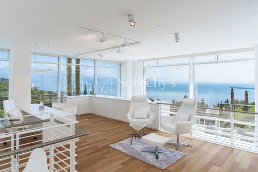 Op de heuvels van Gardone Riviera, met een panoramisch uitzicht op het Gardameer en op korte afstand van Gabriele d'Annunzio's Vittoriale, ligt een complex van architectonische meesterwerken die deel uitmaken van het woonpark Eden Reserve. Hier vindt u deze imposante en exclusieve futuristische villa ontworpen door architect Richard Meier. Met een focus op witte bekleding, kubusvormen en grote glasoppervlakken merkte Meier op: "Dit is wat ons interesseert: licht als bouwmateriaal en het uitzicht als inspiratie." Het lagere niveau beschikt over een uitnodigende entree die leidt naar de gastenkamer met een en-suite badkamer, een wijnkelder, sauna's en een suggestief terras met een overloopzwembad met een adembenemend uitzicht op het meer. Op de bovenste verdieping bevinden zich een woonkamer met een elegante Zweedse open haard, een eetkamer met open keuken en een servicekeuken met toegang tot de wasruimte. De bovenste verdieping beschikt over een lichte studeerruimte, een master suite en twee tweepersoonsslaapkamers met eigen badkamers en panoramisch uitzicht. Het comfort van deze minimalistische villa wordt compleet gemaakt door de vier parkeerplaatsen in de ondergrondse garage, verbonden met de verdiepingen door een lift. Het reservaat waar de villa zich bevindt, onderscheidt zich door de uitstekende conciërge-, eet- en spadiensten die aan de gasten worden aangeboden.