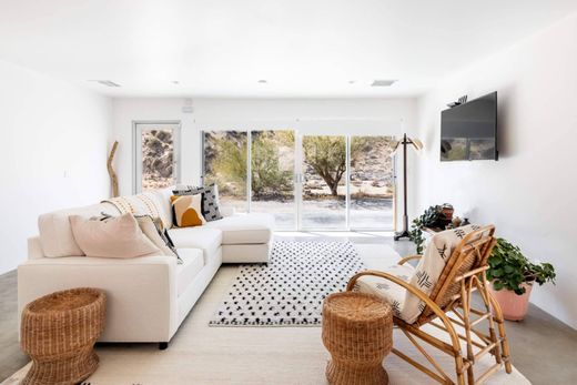 Gelegen op vijf ongerepte acres op slechts vijf minuten van Pioneertown, is dit prachtige juweeltje uit het midden van de vorige eeuw een waar toevluchtsoord in de woestijn. Omringd door adembenemende natuurlijke landschappen, biedt dit huis privacy, rust en een spectaculair panoramisch uitzicht. Stap binnen in een luchtige, open woonruimte met strakke betonnen vloeren en een naadloze binnen-buitenstroom. De moderne keuken, compleet met aanrecht, een roestvrijstalen chef-koksspoelbak en directe toegang tot de patio, is perfect voor entertainment - of u nu onder de sterren grilt of geniet van een rustig kopje koffie in de ochtend. Word wakker in de hoofdslaapkamer met een weids uitzicht over de vallei, waar de fonkelende lichten van Yucca Valley de ruige schoonheid van Joshua Tree National Park ontmoeten. De en-suite badkamer is een spa-achtig heiligdom met dubbele wastafels, dubbele douchekoppen en een ligbad dat is geplaatst om adembenemende vergezichten vast te leggen. De tweede slaapkamer en badkamer bieden een even indrukwekkend uitzicht, met uitzicht op de majestueuze Sawtooth Mountains boven Pioneertown. Elke kamer heeft een schuifdeur die toegang geeft tot de omlopende overdekte patio, waar u kunt genieten van dramatische zonsopkomsten, vurige zonsondergangen, de opvallende rotsformaties en wilde bloemen die dit gebied zo uniek maken. Extra gemakken zijn onder andere centrale verwarming en airconditioning en een aparte was- en bergruimte die toegankelijk is vanaf de patio aan de achterkant. Met meer dan 25 hectare beschermd UC- en BLM-land grenzend aan het pand, kunt u direct vanaf uw voordeur de ongerepte woestijn in wandelen. Perfect als een vredig persoonlijk toevluchtsoord of een kant-en-klare Airbnb, dit huis ligt dicht bij al het beste dat de hoge woestijn te bieden heeft, zonder dat dit ten koste gaat van de rust.
