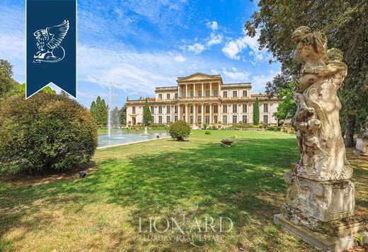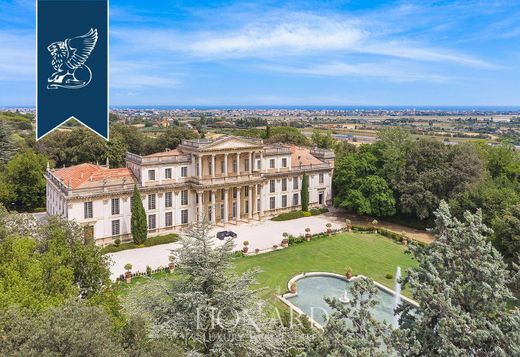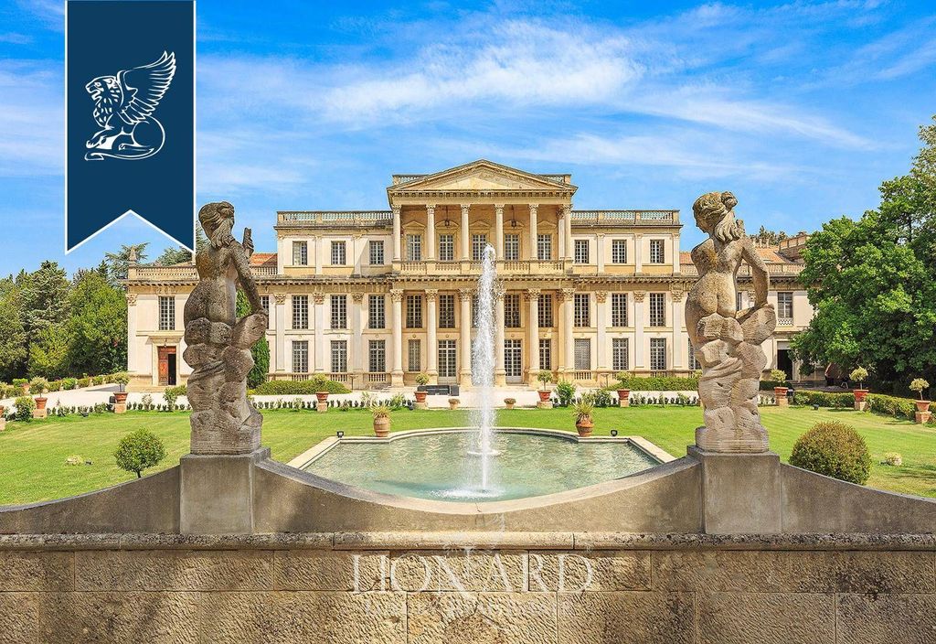 Indrukwekkende luxe villa in neoklassieke stijl, een authentiek meesterwerk uit 1600, te koop in de heuvels van Rimini, aan de levendige Riviera Romagnola. Dit majestueuze huis, geflankeerd door een boerderij, twee wachthuisjes en een fascinerende geschiedenis, heeft een binnenruimte van ongeveer 5.870 vierkante meter. Het uitgestrekte landgoed beslaat een prachtig park van 10 hectare, met onder andere Engelse en Italiaanse tuinen, een citrusboomgaard, een suggestief panoramisch uitkijkpunt en diverse kassen. De villa is een zeldzaam voorbeeld in Italië van het Franse eclecticisme in de architectuur uit de Napoleon III-periode. Het werd in 1660 gebouwd voor de adellijke familie Diotallevi en in 1843 gekocht door de Parijse edelman Marie Joseph Adolph Noël Des Vergers, een beroemd Etruskoloog en cultureel man. De residentie groeide uit tot een kosmopolitisch referentiepunt voor intellectuelen, kunstenaars en politici uit die tijd. In 1936 werd het gehele landgoed gekocht door Prins Don Mario Ruspoli, die Pietro Porcinai, een belangrijke Italiaanse landschapsarchitect uit de 20e eeuw, opdracht gaf om de tuin tussen 1936 en 1937 te renoveren. De villa, die zich uitstrekt over 4000 vierkante meter, heeft een neoklassieke voorgevel, gekenmerkt door grote ramen en elegante zuilen met kapitelen. Binnen biedt de villa, met 24 slaapkamers en 30 badkamers, een ongeëvenaarde luxe-ervaring. Cassetteplafonds, marmeren zuilen, lichtbogen en imposante trappen sieren de weelderige kamers, terwijl fraaie kroonluchters en verfijnd meubilair een koninklijke sfeer creëren. Op het uitgestrekte landgoed bevinden zich ook de citrusboomgaard (900 m2), de boerderij (1700 m2), drie kassen (340 m2) en twee symmetrische wachthuisjes aan de zijkanten van de toegangspoort (84 m2). Van de 10 hectare die de neoklassieke residentie omringen, behoren er 7 tot het park. De overige 3 hectare zijn bestemd als bouwland en onbebouwd land, met olijfbomen langs de met pijnbomen omzoomde laan die de villa met de weg verbindt. Referentie 0497