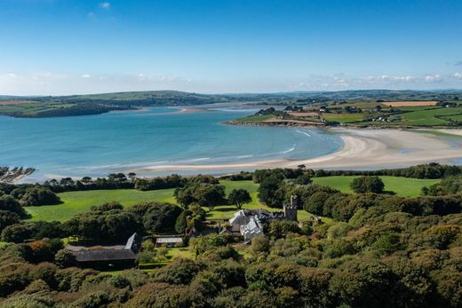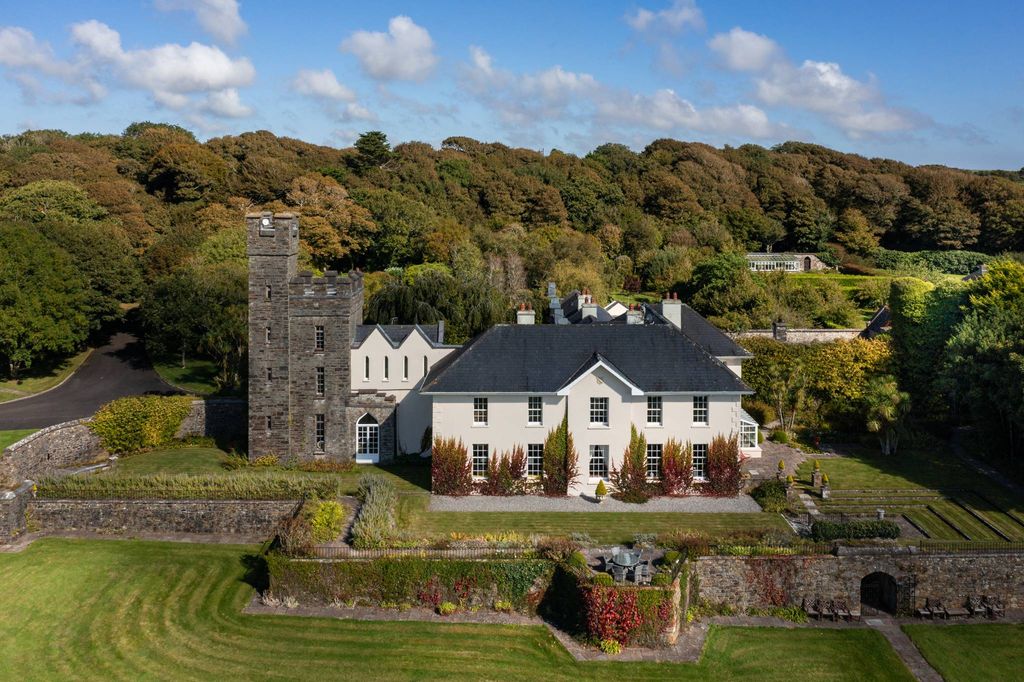 Een buitengewoon aantrekkelijk en magisch 18e-eeuws kasteel, glorieus gelegen in een privépark met een prominente ligging met uitzicht op zee en de monding van Courtmacsherry Bay, op slechts 18 minuten rijden van het modieuze stadje Kinsale. Het terrein beslaat in totaal ongeveer 23 hectare. 6 ontvangstruimtes, 9 slaapkamers en 6 badkamers. Het landelijke uitzicht over het glooiende landschap combineert prachtig met het weidse uitzicht op zee, wat zorgt voor indrukwekkende en panoramische vergezichten vanaf het kasteel en het terrein. Een met bomen omzoomde laan biedt een magische toegang, vanwaar een stenen boog naar een binnenplaats leidt. Aantrekkelijke stenen muren zorgen voor een uiterst aangename esthetiek. Het huis verkeert in uitstekende staat en is ronduit magisch. Het symmetrische, originele Georgiaanse huis met vijf traveeën wordt prachtig aangevuld door de 19e-eeuwse kasteeltoren en de kantelen met borstweringen, waardoor een prachtig, aantrekkelijk en leuk huis ontstaat. De accommodatie is goed ingedeeld en gemoderniseerd voor comfortabel wonen, waarbij modern comfort naadloos is geïntegreerd, terwijl het fantastische historische karakter behouden blijft. De ontvangstruimtes zijn indrukwekkend met grote ramen en royale plafondhoogtes. Ze sluiten perfect aan op de omgeving en bieden uitstekende entertainment, maar zijn ook comfortabel. De royale keuken met de heerlijk grote tafel is een geweldige ruimte en prachtig ontworpen voor een gezellige, informele bijeenkomst met familie en gasten. Er zijn ruime slaapkamers en suites, en de serre op de begane grond is uitzonderlijk. De bijgebouwen, begroeid met klimop en gemaakt van lokaal gehouwen steen, sluiten naadloos aan op de kasteelachtige omgeving en omvatten drie stallen en een lodge met drie slaapkamers. De tuinen en het terrein zijn prachtig. Zeer privé en beschut, maar toch met een prachtig uitzicht op zee. Een mix van formele terrassen en verzorgde gazons in de directe tuinen, minder formele tuinen en het bredere parklandschap werkt uitstekend. Het gebruik van verzorgde paden in het parklandschap werkt uitstekend om de tuinen naadloos te verbinden met het omliggende landschap en biedt zeer bruikbare wandelpaden. De buitenste kustgebieden verbinden het landgoed nauw met de zee en bieden een aantal prachtige privébaaien en stranden. Coolmain Beach staat bekend om zijn ongerepte, poederachtige zand. Al met al vormen de verschillende onderdelen van het landgoed samen een werkelijk magisch en aantrekkelijk landgoed van circa 23 hectare. Coolmain Castle heeft een rijke en magische geschiedenis en is de afgelopen 35 jaar het thuis geweest van de familie Disney. Coolmain Castle werd in 1989 gekocht door Roy E. Disney, neef van Walt Disney en vice-charmant van de Walt Disney Company, en is sindsdien grondig gerestaureerd en gemoderniseerd. Bekende eigenaren vóór de Disney's waren onder andere Henry Boyle Bernard, Thomas Wyse, Hibernicus Scott, romanschrijver Donn Byrne, fotograaf Bob Willougby 'de man die de fotojournalistieke filmstill vrijwel heeft uitgevonden' en, zeer recent en toepasselijk, de familie Disney. Het dateert uit het begin van de 18e eeuw en is een magische mix van diverse toevoegingen en wijzigingen, die in lijn zijn met de veranderende architectuurtrends van de afgelopen eeuwen. Deze architectuur is prachtig gelaagd en getextureerd. De combinatie van de prachtig gekleurde lokale stenen muren en de zeer pittoreske locatie met uitzicht op zee maakt Coolmain Castle werkelijk authentiek en aantrekkelijk. Gelegen in het schilderachtige en levendige zuidwesten van Ierland, vindt u vele bloeiende en bruisende kustplaatsen in de buurt, waaronder het populaire Kinsale, een populaire historische zeilstad met een ruime keuze aan goede restaurants, een diepwaterhaven en de beroemde Old Head-golfbaan. Wandelpaden, golf- en zeilmogelijkheden zijn er in overvloed. De stad Cork is gemakkelijk te bereiken, op slechts 44 km afstand en de internationale luchthaven van Cork op minder dan 30 minuten rijden. Het kasteel kan volledig gemeubileerd en inclusief tuingereedschap en -uitrusting worden geleverd. De vraagprijs bedraagt € 7.500.000.