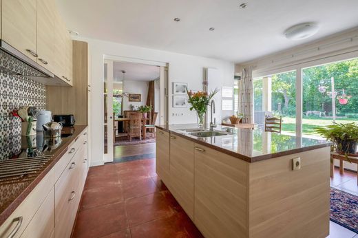 De royale eetkeuken grenst aan de woonkamer en is hiermee verbonden door dubbele schuifdeuren. Ook hier zorgen grote glaspartijen voor veel licht. De keukeninrichting is praktisch in drie opstellingen: een wandopstelling met diverse inbouwapparatuur zoals een 5-pits inductiekookplaat, afzuigkap, oven, combi-oven magnetron en koelkast. Het werkblad is van composiet en de achterwand heeft Portugese tegels. Daarnaast is er een spoeleiland met een vaatwasser, composiet werkblad en anderhalve spoelbak, en een ingebouwde kastenwand.