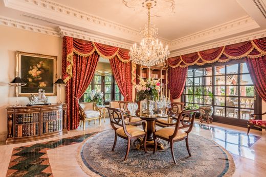 Grand Villa met panoramisch uitzicht op zee en gastenverblijf in Sierra Blanca. Deze prachtige villa, gelegen op een indrukwekkende locatie hoog in de heuvels van Sierra Blanca, biedt een spectaculair panoramisch uitzicht over de Middellandse Zee en de Afrikaanse bergen in de verte. Gebouwd met hoogwaardige materialen en handgemaakte details, combineert de villa klassieke architectuur met Moorse inspiratie, wat zorgt voor een tijdloze sfeer. De hoofdwoning verwelkomt u met een prachtige hal, versierd met handgesneden zuilen en een centrale binnenplaats met een fontein. De elegante woonruimtes sluiten naadloos aan op de terrassen op het zuiden, met een ononderbroken uitzicht op zee. De volledig uitgeruste keuken met hoogwaardige apparatuur staat in verbinding met een formele eetkamer, terwijl diverse gastensuites en woonkamers comfort en privacy in het hele huis bieden. De bovenverdieping beschikt over een gezellige woonkamer en ruime slaapkamers, waaronder een spectaculaire master suite met gewelfde plafonds, een kleedkamer, een spa-achtige badkamer en een privéterras met panoramisch uitzicht op de kust. Op de begane grond bevinden zich een grote garage, een wijnkelder, een fitnessruimte met sauna, een werkplaats en een privéappartement met een aparte ingang, ideaal voor personeel of gasten. Extra hoogtepunten zijn onder andere een apart gastenverblijf met twee slaapkamers, een paviljoen aan het zwembad met een zomerkeuken en kleedkamers, en aangelegde tuinen met schaduwrijke terrassen en een verwarmd zwembad. Deze villa biedt absolute privacy, 24-uurs beveiliging en een uitzonderlijke levensstijl op slechts enkele minuten van Marbella en Puerto Banús.