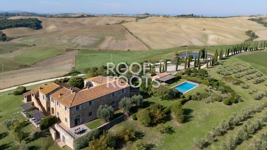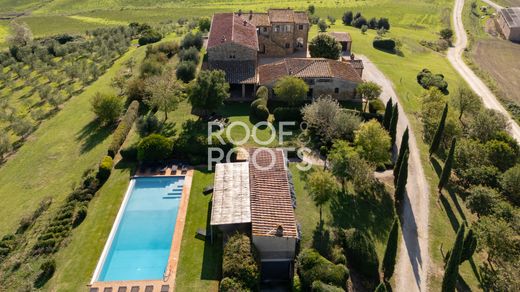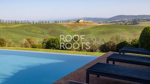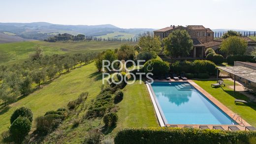 In het poëtische landschap van de Crete Senesi, waar glooiende heuvels elkaar kruisen met cipressen en oude dorpjes, staat een historische 18e-eeuwse villa. De woning geniet een indrukwekkende en panoramische ligging, met 360 graden uitzicht op het meest authentieke Toscaanse landschap. De woning, zorgvuldig gerestaureerd door de architect-eigenaar, is omgetoverd tot een luxe woning die de rustieke charme van de Toscaanse architectuur harmonieus combineert met eigentijdse designelementen. De kamers zijn ruim, licht en gastvrij, ontworpen om comfort en schoonheid in elk detail te bieden. Het complex beslaat ongeveer 750 vierkante meter en omvat het hoofdgebouw, een apart bijgebouw en twee gastenappartementen. In totaal beschikt de woning over 12 slaapkamers en 12 badkamers. De begane grond van de hoofdboerderij bestaat uit een eetkamer met een monumentale open haard, een woonkamer met directe toegang tot de overdekte eethoek in de buitenlucht, een professionele keuken, een bibliotheek met open haard, een gastentoilet, een tweede entree met wasruimte en bijkeukens. De bovenverdieping beschikt over vier suites met eigen badkamer, twee overdekte terrassen en een extra slaapkamer met badkamer en aparte keuken. Een buitentrap leidt naar de kelder en de bijkeuken in de kelder. Het gastenverblijf bestaat uit een woonkamer, een keuken met eethoek, drie slaapkamers, drie badkamers, een overdekt terras en een eigen tuin. De twee appartementen, één op de begane grond en één op de eerste verdieping, beschikken elk over een woonkamer met keuken, twee slaapkamers, twee badkamers en een overdekt terras. Elke kamer is zorgvuldig gerestaureerd, waardoor het adembenemende uitzicht vanuit elk raam wordt versterkt. De villa is omgeven door ongeveer 2,5 hectare grond, versierd met 250 olijfbomen en een privémeer dat wordt gebruikt voor irrigatie. Het overloopzwembad met panoramisch solarium grenst aan een poolhouse met een professionele keuken, eetkamer, badkamer, garage en bergingen. Gelegen in de gemeente Asciano, is de woning omgeven door een landschap van zeldzame schoonheid, op korte afstand van beroemde steden zoals San Giovanni d'Asso, Montalcino en Siena. Dankzij de structuur en de bevoorrechte ligging is de villa zowel ideaal als exclusieve privéwoning als locatie voor spraakmakende evenementen en ceremonies.