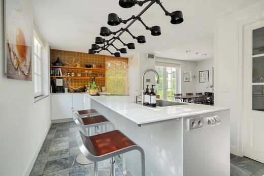 Keuken met luxe inrichting van het merk Valcucine, bestaand uit een eiland met composiet blad met RVS spoelbak, combi- Quooker, BORA- inductiekookplaat met afzuiger (geïntegreerd), een eetbar en diverse kasten en lades. Wandmeubel met 2 koelkasten, een vriezer, espressomachine, combi-oven en 2 warmhoudlades en een vaatwasser. Aan de andere zijde is een meubel/koffiecorner geplaatst met klein composiet werkblad en kastruimte. Een loopdeur biedt toegang tot de tuin.