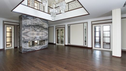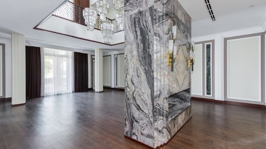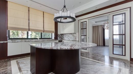 Object number: RU0568. A house on Rublevo-Uspenskoe highway, 5 km from Moscow, in the cottage village Barvikha-21 is offered for sale. The 2-level brick house (area - 943 sq.m.), is located on a land plot of 34 acres. There is a garage for 2 cars. All communications are central. Finishing - turnkey. In the basement: hall, guest bedroom, cinema room, ironing and laundry room, utility rooms. On the first floor: entrance hall, hall, dressing room, guest bathroom, living room, dining room, kitchen, professional kitchen, pantry, study/bedroom with bathroom, laundry room, staff room with bathroom, boiler room, garage for 2 cars. On the second floor: master bedroom with bathroom and dressing room, bedroom with its own bathroom, second living room. On the site: for the staff there is a living space in a separate garage for cars, on the 2nd floor. The house is built from durable and premium foreign materials. Built according to an individual project in the style of F.L. Raita, with high ceilings and a large glazing area. Premium materials, original decorative elements and equipment from famous brands. The facades are complemented by natural stone tiles, the plinth, terraces, flower beds and volumetric external elements are faced with natural stone slabs of a contrasting shade. The balconies and terraces are faced with granite slabs with additional heat treatment. The site has a park landscape design and complex landscaping. TWEED Real Estate is a member of the AREA association.