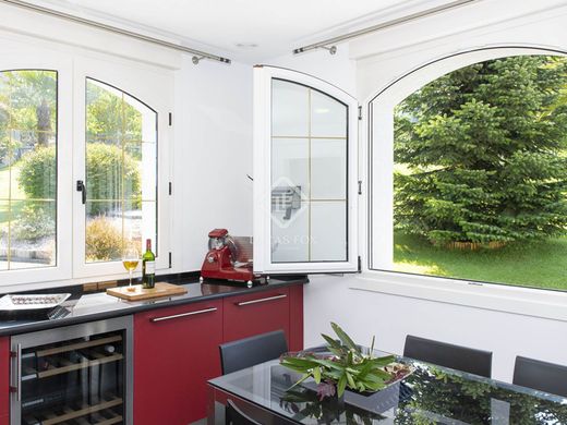 The property consists of two floors, on the main floor we find the entrance hall which leads to the living area, to the left-wing we find the fully equipped eat-in kitchen, finished with good quality carpentry and well-maintained appliances, features plenty of natural light and views of the garden and direct access to it. In the same area, we access the dining area and living room, separated by a double-sided fireplace and featuring a unique design.