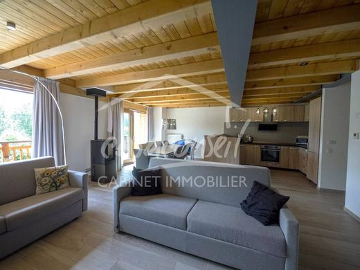 In Chalet designed and built in 2017, we offer you splendid volumes divided into 4/5 rooms, bedrooms with bathrooms, balconies, large living room with fireplace, kitchen. typical mountain atmosphere to enjoy this corner of paradise over the seasons.