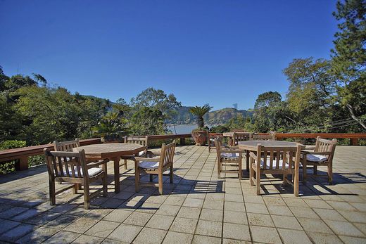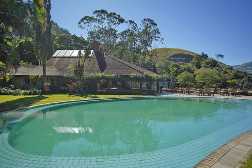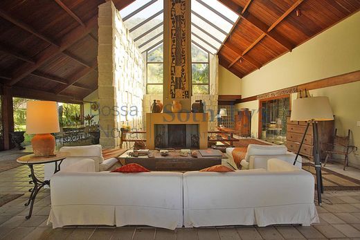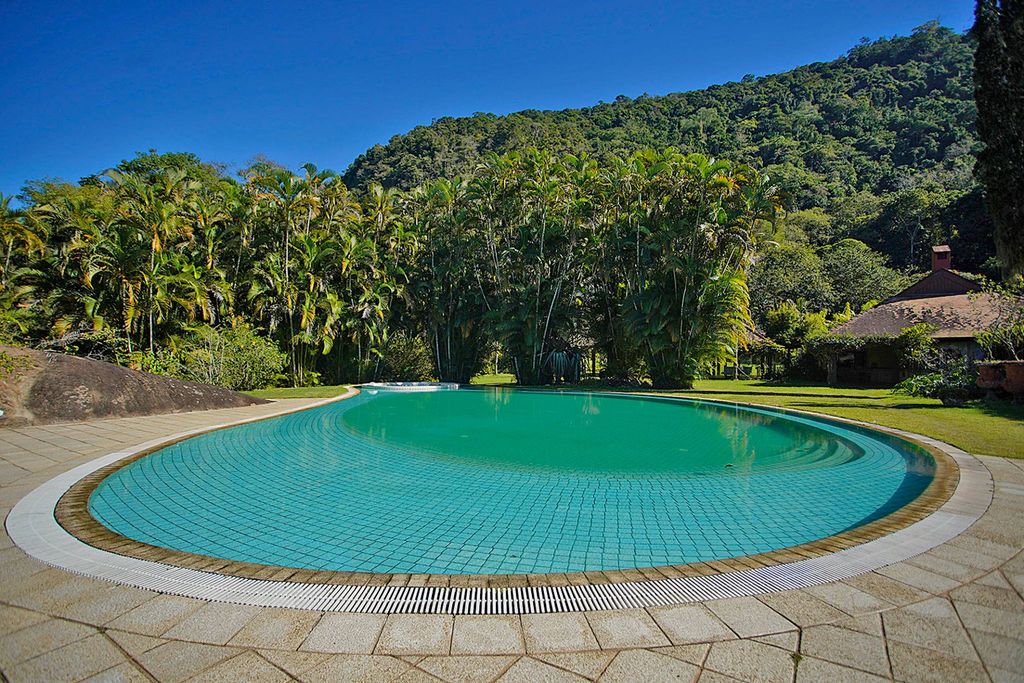 Located in Mangaratiba on the Costa Verde, just 80 km from Rio de Janeiro, this property was designed by the renowned architectural firm Casé e Acioli, decorated by AMC Designers, and furnished with cataloged antiques sourced from around the world. Portuguese artisans crafted spectacular woodwork, including cathedral ceilings, carved fireplaces, and a kitchen finished in bois de rose wood. The outdoor area features a cinematic pool with ocean views, a vintage billiard table, a bar, a home theater, dry and steam saunas, a floodlit tennis court, a stone wine cellar, a pizza oven, private gardens, an organic vegetable garden, a fruit orchard, and a pond. The estate comprises a main house with winter and summer living rooms, a master suite with two bathrooms, four suites with fireplaces, and five guest bedrooms, two of which are independent suites, totaling twelve finely decorated bathrooms. The water supply comes from an exclusive permanent spring. Technical features include a separate 75 KVA transformer, 110/220-volt wiring throughout the property, a 700-liter boiler, a Lutron lighting system, Philips Pronto remote control system for lighting, curtains, sound, and home theater, central and split air conditioning, Italian hardware, and a state-of-the-art security system. The property offers private access directly from the Rio-Santos highway, a large lawn that serves as a helipad, and the possibility of building a private marina.