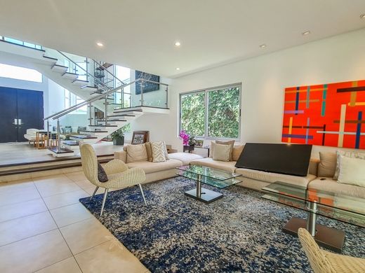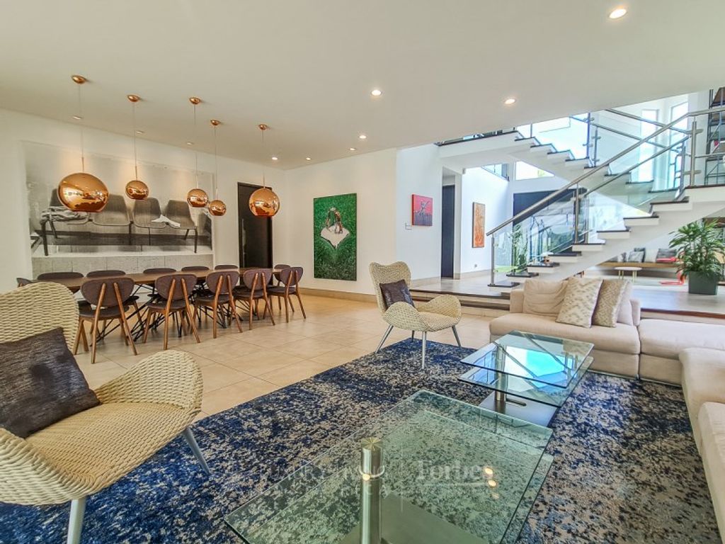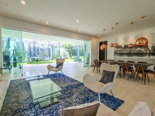 The property stands out for its contemporary architectural design, featuring floor-to-ceiling windows that allow for cross ventilation and fill the social areas with natural light. The main level offers a combined living and dining space, complemented by a spacious lobby and guest bathroom. The functional, well-equipped kitchen includes two pantries, a service room with a bathroom, and a laundry area. A covered terrace extends the social spaces into the private garden, perfect for outdoor gatherings. The two-car covered garage is complemented by additional outdoor parking.