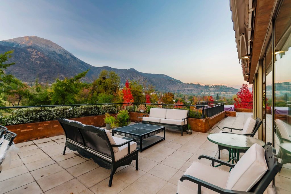 Luminous penthouse in an exclusive condominium. Only 1 apartment per floor. Private hall, entrance hall, separate living room, and dining room with sliding door and access to a large terrace with a beautiful view of the Polo Club golf courses. Large suite, two walk-in closets, bathroom with Jacuzzi, double sink, shower, and natural light. Large living room (option two bedrooms as the original plan) and a full bathroom. Another bedroom suite. Guest bathroom. Internal ladder and direct external elevator to the 5th floor go up to a large family room with a panoramic view, bathroom, closets, and ladder exit. The large terrace surrounds the apartment, achieving a clear view of the Andes mountain range and Cerro Manquehue.