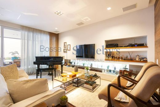 House with quality finishes and unique works, such as the panel in the external area by artist Toz Viana, a sideboard with wood by Hugo França and the decoration by Dado Castello Branco. It has demolition wood paneling in the living room, gourmet space, heated pool, Artigiano kitchen, Intelbras security system, ducted air conditioning, rooftop with gym and office with terrace and bathroom, armored doors, central vacuum, automated shutters and cabinets. In the intimate area, three spacious suites, the master with a terrace. The property has three parking spaces.