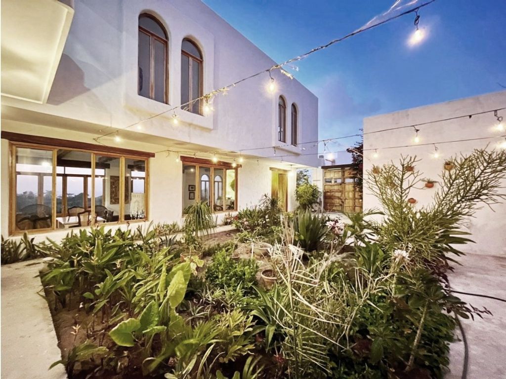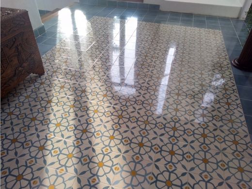 Precious and unique with its Andalusian style in Alto de Salgar, the beautiful architecture of this house built detail by detail by designers can be seen. You can appreciate the perfect harmony of its white walls in contrast to the cured wooden beams and the colorful Trinidadian beams. Its high ceilings, arched windows, wooden floors, unique design in beautiful blue tones, and the surrounding landscape give it visual serenity and freshness. All the elements generate a calm and beautiful home experience.