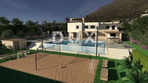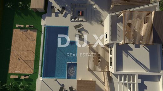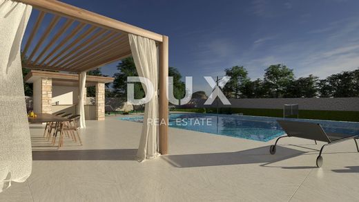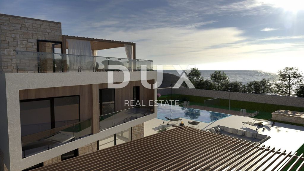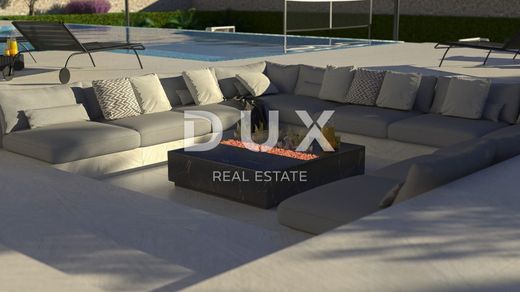 Near Vodnjan, known for its excellent olive oil, wine and other Mediterranean delicacies, in the new part of the village with a view of the Brijune National Park, this villa is located on a plot of approx. 1,000 m2. The ground floor of the house will consist of an entrance hall, a toilet, a storage room and a large open space of 73.20 m2, which will house a large modern kitchen with an island, a dining room and a living room with a fireplace. There will also be a tavern in the Istrian style on the ground floor with a large fireplace and a wooden table with benches. The tavern will have its own separate storage room with a toilet. Access to the tavern will be both from the inside of the house and from the outside of the house. On the ground floor there will be 3 large glass walls overlooking the pool and an outdoor covered terrace with a large table. There will be 3 bedrooms on the first floor, one of which is a master with its own bathroom and wardrobe, 25.50 m2, and a terrace. On the first floor there will also be a study with a terrace, a corridor, a bathroom and a storage room. On the first floor there will also be an area with a gym and a sauna with a toilet and a shower, which will have an external entrance by stairs, in front of which there will be another covered terrace of 19.67 m2 for enjoyment after a hard workout. The house will also have access to the flat roof, where there will be a summer kitchen with a table for enjoying food and drink and a beautiful panoramic view. All external units for heating and cooling the house will be located on the rest of the roof. The house will be equipped with high-quality PVC carpentry, parts of the house will be covered with stone, the interior of the house will be covered with high-quality large-format tiles and high-quality sanitary ware. As well as custom-made furniture. The entire house will be smart, so lighting, heating and cooling, swimming pool, blinds, video surveillance, etc. can be controlled via multiple displays, tablets and mobile phones. The exterior of this villa will certainly be special, with a large overflow pool of 60 m2, which will have a separate jacuzzi. The pool will be heated, with salt water, a waterfall and LED lighting in colors and a shower. Next to the pool there will be a place to relax by the fire, which will be level with the sunbathing area. The summer kitchen will be equipped with all kitchen appliances, a grill, a bar with bar stools and a TV for enjoying sports matches. On the lower part of the land below the pool, there will be a beach volleyball and soccer field with its own lighting for evening games. A storage room with pool equipment will be located next to the playground behind the benches. The house will have 3 covered parking spaces with an automatic gate and a separate smaller entrance. The house will be surrounded by greenery, olives, lavender and other Mediterranean plants, fully equipped with automatic irrigation.