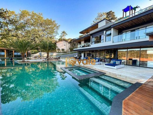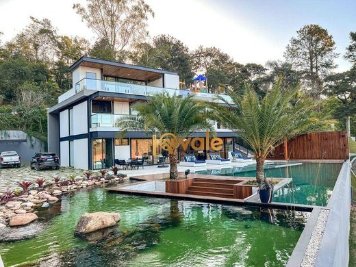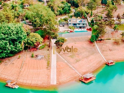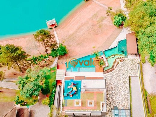 Mansion on the banks of the Igaratá Dam for sale, 670 m² in the Recanto Pássaros Condominium, Jacareí, SP. Luxury home with complete privacy and a stunning view of the Igaratá Dam. The total area is 4,263 m², with a built-in area of 670 m² and 5 suites, 3 of which overlook the dam. The house features a cinema, integrated kitchen with a full gourmet kitchen, finely decorated living rooms with three distinct areas, a laundry room, a pantry, a powder room, and an elevator. The stunning outdoor area includes a fireplace, a fully equipped gym, a sauna, a swimming pool and heated spa, an ornamental lake, a 50 m² pier with a sound system, a playground, and a boat garage. Our goal is to make your dream or a great investment come true! i9Vale Sales: On your time, your way! A real estate agency specializing in luxury and high-end properties in São José dos Campos, Jacareí, and the surrounding region.