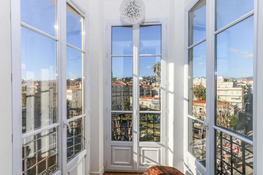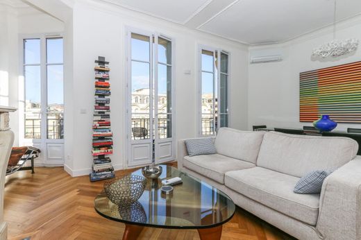 Short term rental. Stunning modern apartment located 5 minutes walk from the sea, pedestrian zone and place Massena, in perfect condition of 90 m² living space, on the second from top floor of a bourgeois building in one of the most beautiful areas of the Carré d'Or, with the view of church and garden and two balconies.