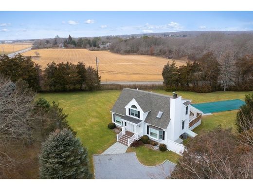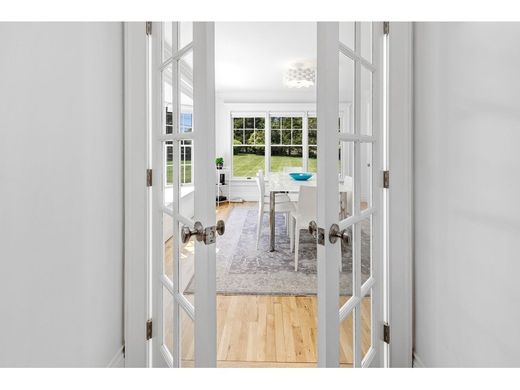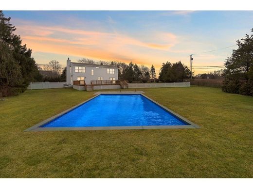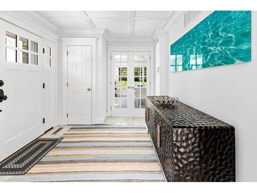 Centrally located where Seven Ponds Towd Road begins, this just-renovated home has sweeping farm views and now abuts 5 acres of Town land to the rear. There are four bedrooms, 3.5 bathrooms, a finished basement and a heated 50 foot pool. The first floor has a marble entry foyer that opens into a spacious living room with a cathedral ceiling and black granite wood burning fireplace; a sunny formal dining room with French doors; a separate chef’s kitchen with white cabinets, marble countertops, and high end appliances (Wolf /Sub-Zero/Miele); and a hallway powder room. Upstairs the primary bedroom suite has a marble bathroom with jacuzzi tub; and two additional guest bedrooms share a marble bathroom with custom glass shower. The tastefully finished basement has a gallery/foyer, bedroom, porcelain tile bathroom with glass-enclosed shower, spacious media/entertainment room; and a laundry room. A massive outside rear deck affords panoramic farm field and sunset views and overlooks the 50 foot heated vinyl pool with Bluestone patio. The professional landscaping includes privet hedges, deer resistant Arbor Vitae trees, and an extensive irrigation system. Recent HVAC system, custom window treatments and stunning landscaping complete this turnkey home. Located a short distance from Flying Point ocean beach the shopping/villages of Southampton, Water Mill , Bridgehampton and Sag Harbor. Furnishings separately available. Recent survey with elevations upon request.
