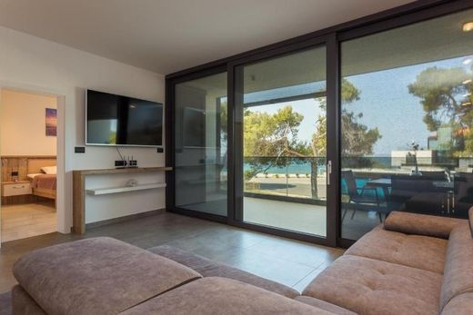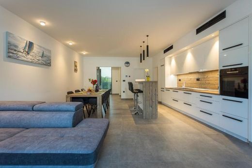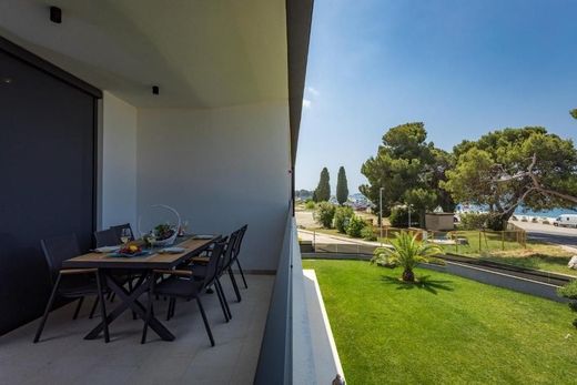 In Fažana, 80 meters from the beach, a luxury apartment by the beach is for sale. The apartment is located in a two-story residential building of superior construction, equipment and design. The yard of the luxurious new building is fenced and the parking spaces are paved. In addition to a parking space, each apartment also has a storage area of approx. 6 m². The carpentry in this urban building is aluminum with electric shutters and mosquito nets, and the doors are burglar-proof. It is equipped with underfloor heating/cooling via a heat pump. All apartments are completely fully equipped and custom-furnished and are sold as such. The subject apartment of 120 m² is located on the first floor of the building. It consists of a living room with dining room and kitchen, two bedrooms with private bathrooms and toilets. The living room has access to a spacious terrace with an unobstructed view of the sea. This luxurious new development within walking distance of shopping, cultural, educational and recreational facilities is the perfect property whether it is a family home or rental. The seller is a legal entity, therefore the buyer does not pay real estate sales tax.