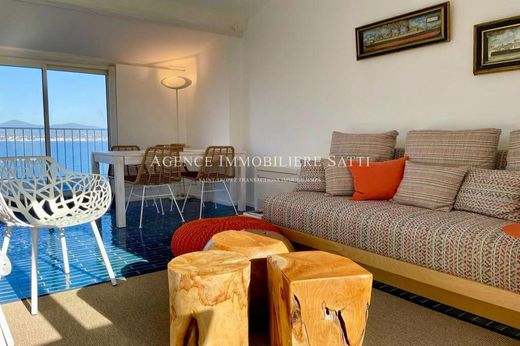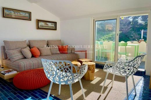 The apartment, spread over two floors, proposes two en-suite bedrooms, a crossing living/dining room with an equipped American kitchen, opening onto two magnificent terraces, one with a panoramic view of the Saint-Tropez gulf and the mythical Ponche beach, another with a view of the Old Citadel and the sea.