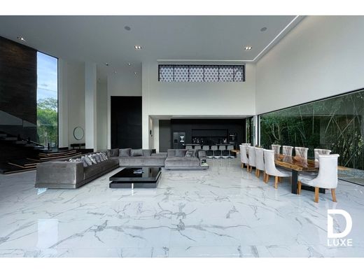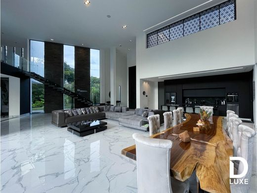 The minimalist home located on an impressive lot of approximately 4,600m2 integrates perfectly with the natural environment that surrounds it. With a constructed area of around 900 m2, this contemporary house offers a clean and elegant architectural design. Upon entering the property there are two entrances, one auxiliary from the covered parking space with capacity for 2 cars, connecting the service room to the laundry area and the pantry with the kitchen and a main access that is accessed through a large door 3 meters wide by 5 meters high, which creates an impressive visual impact and a feeling of welcome. As you go through the entrance you discover a spacious and bright space that includes the main room, the dining room and the kitchen. With a headroom of 650 metres, this open-plan space offers a feeling of spaciousness and fluidity.On the first floor is a cinema room designed for the entertainment of residents and their guests. With capacity for 13 people, it has electric chairs and a 120" screen, providing a first-class cinematographic experience. There are also two bedrooms with dressing rooms and private bathrooms on this floor, providing comfort and privacy for residents and their guests. The second floor is accessed via minimalist floating stairs adding a visually appealing and elegant element.Upon reaching this level is an additional living room ideal for moments of relaxation and rest.A corridor with views of the surrounding lot leads to two more bedrooms each one with its own dressing room and private bathroom.At the end of the corridor is the main room designed with security elements such as a security door and a dressing room with a security door.In addition, the main bathroom has a jacuzzi and interior gardens creating an atmosphere of serenity and connection with nature.In addition, the main room has a hidden panic room providing an additional level of security and tranquility.Outside the house there is an impressive pool with a lost horizon design which creates a sensation of continuity with the surrounding landscape. The pool has a beach around its perimeter, providing a space to relax and enjoy the surroundings. Next to the pool there is a spacious jacuzzi with capacity for 12 people where you can enjoy moments of relaxation and well-being. In addition, the house has a social room equipped with a barbecue area ideal for meetings and outdoor events. An outdoor room with a fireplace provides a cozy and warm space to enjoy on cool nights.A fully equipped 75m2 gym is located on a lower level, giving residents the opportunity to stay active and fit without leaving home. A cellar and the machine room for the pool are also included in this area. The entire exterior design is connected through an ecological path that crosses the guaduales allowing residents to explore and fully enjoy the natural environment that surrounds the house. In short, this minimalist house is a testimony to the beauty of contemporary architecture and harmony with nature. Its functional and elegant design combined with luxury elements and modern comforts creates an impressive and welcoming space to enjoy life in an exceptional natural environment.
