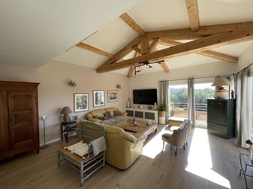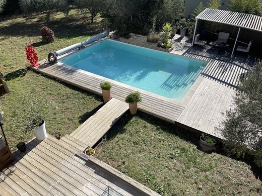 Located in a quiet area of Garde Freinet, beautiful property of approximately 350 m2 of living space built on land of 3238 m2. The whole is divided into 2 parts, a main building of approximately 210 m2 and 3 independent apartments of 45 m2 each. Main villa: A beautiful entrance which takes us to a large living room type living room / dining room, high ceilings, pellet stove, guest toilet, large American kitchen which opens onto an outdoor terrace. On the same level a corridor which serves a laundry room and a beautiful Master bedroom, shower room, double sink bath and dressing room. In the entrance a connecting door takes us into the garage where we find a workbench and a laundry area. Upstairs 3 beautiful bedrooms including a Master type with its walk-in shower, double sink and toilet. A beautiful south-facing terrace connecting the Master bedroom as well as a corner converted into an office. On the same level, a separate toilet, a bathroom including a walk-in shower, double sink and bathtub. Outside, a large terrace, part of which is covered and equipped with a summer kitchen with all the commodities. Below a traditional chlorine swimming pool of 8m by 5m as well as a pergola. The outdoor spaces are nicely planted: Olive trees, oleanders etc. Located right next to the main building, a set of 3 independent apartments type T2 approximately 45 m2. In each of them a living room, high ceilings, open-plan kitchen, upstairs bedroom and shower room. Each apartment is air-conditioned and benefits from good rental profitability as well as a clear view of the countryside. The whole is connected to the mains sewer and to town water (water tower nearby). There is also a borehole with its lifting pump. Independent electrical group. Heating system by heated/cooling floor, thermodynamic tank. Videophone and electric gate. The villa is built on a crawl space. At the entrance to the property you will find several parking spaces, a technical room for drilling as well as a large carport of 50 m2. Commercial agent registered with the RSAC of FREJUS under number 884 345 919 Information on the risks to which this property is exposed is available on the Georisks website: www.georisks.gouv.fr