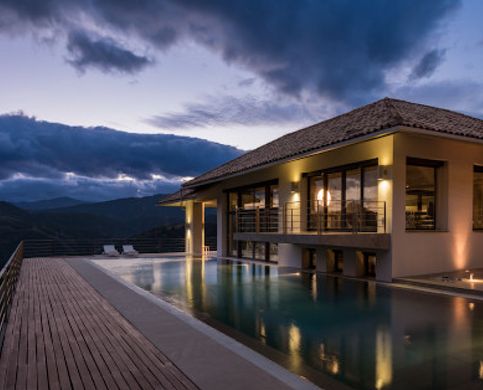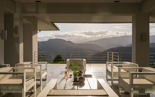 On the main floor there is a spacious kitchen with Gaggenau appliances, and a large island to enjoy cooking while family and friends sit at the casual dining corner with panoramic windows, and views to the countryside. A large dining room for receptions, with a huge window offering views of the terrace and surrounding hills, leads on to a spectacular living room, with high ceilings with views to the pool and the mountains. A lovely reading corner offers a more intimate setting. A beautiful sitting area leads into the guest wing, comprising three large guest suites with large wardrobes and marble bathrooms.