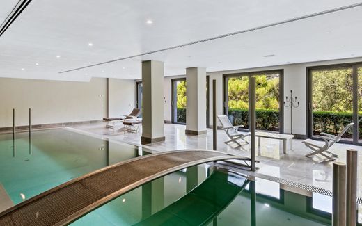 At lower ground level, there is a Spanish-style wine cellar large enough to hold around 1,500 bottles; games, TV and relaxation area, indoor heated swimming pool (11m long and 1.70 m. deep) with large windows, sauna, Hammam, shower, oversized laundry, storage and engine room, garage for 6 cars, bedroom with floor to ceiling windows in staff quarters. The elevator connects all floors.
